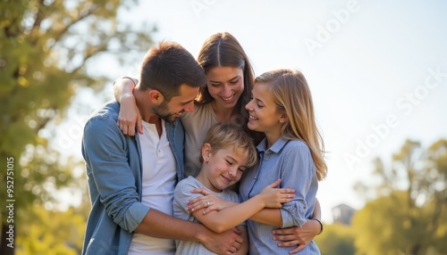 Happy Family Embracing Outdoors Creating Memories, Joyful Parents and Children Bonding in Nature During Holiday Vacation