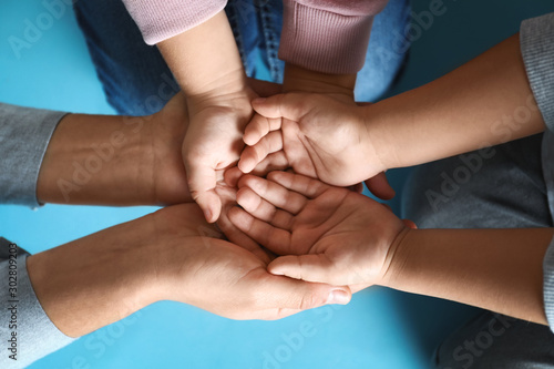 Happy family holding hands on blue background, top view