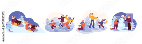 Happy Family in Winter Season Enjoy Recreation Activity Vector Set
