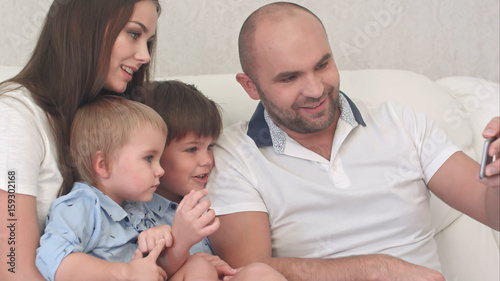 Happy family looking at their photos on the phone