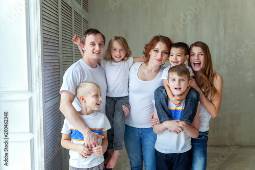 Happy family mother, father and five children near the wall at home. Woman, man and little kids relax in a white bedroom. Happy family at home. Young parents playing whith their children
