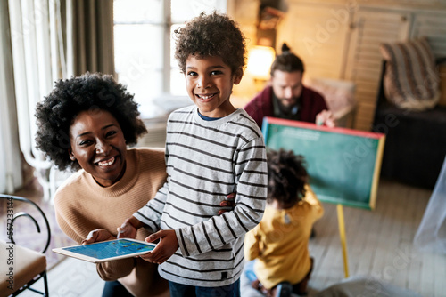 Happy family. Multiethnic parents are playing with children. Education technology people fun concept