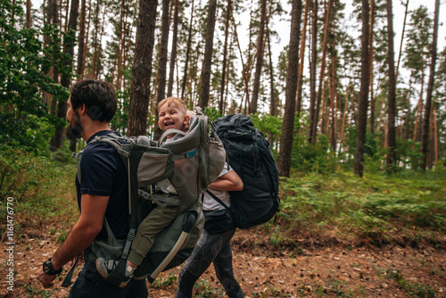 Happy family on a hike with a child in a travel backpack. laugh, smile, get together and have a good time together