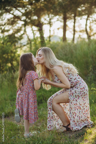 Happy family on a summer meadow. little girl child daughter hugging and kissing mother