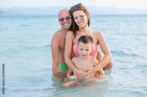 Happy family on the beach, blue ocean background.