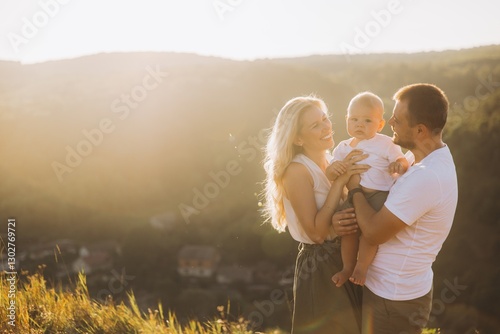 Happy Family Outdoors Enjoying a Sunny Day in Nature with Smiling Parents and Baby