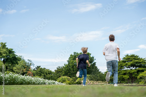Happy family parent children having picnic outdoor activity. Enjoy happiness moment summer playing together including father mother son and daughter relaxing in the morning sunrise.