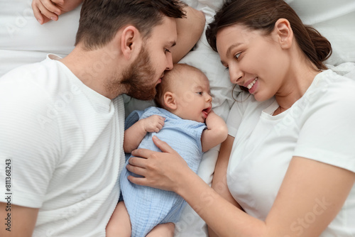 Happy family. Parents with their cute baby on bed, top view