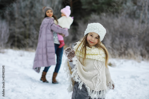 Happy family playing and laughing in winter outdoors in the snow. City park winter day.