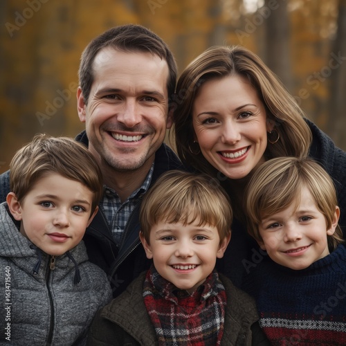Happy Family Portrait Outdoors Autumn Season Loving Parents and Three Young Boys Smiling Warmly