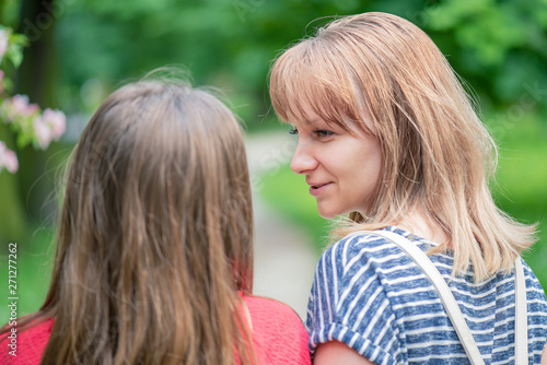 Happy family resting together - mother and daughter walking in park at summer or spring day. Beautiful woman talking to teen girl and smiling. Outdoors portrait - back view.