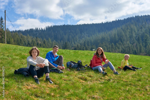 Happy family sitting on grass outdoors in park. happy young family spending time outdoor on a summer day