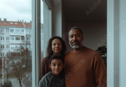 Happy family standing by window in modern apartment, warm and cozy home atmosphere