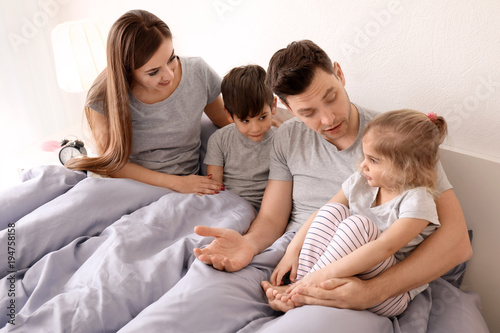 Happy family with children on bed at home