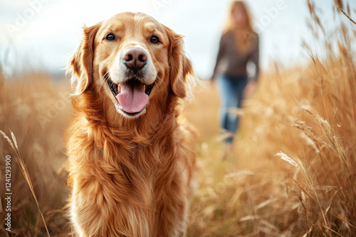 Happy family with kids walking their pet golden retriever dog in the spring meadow. Active spring holidays