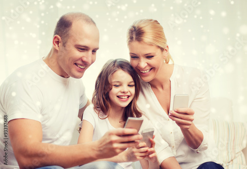 happy family with smartphones at home