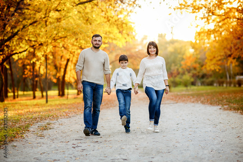 Happy family with teenage son outing in autumn park. Educational process, socialization of children.