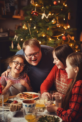 Happy family witj children with Down syndrome eating festive Christmas dinner at home. Generative AI