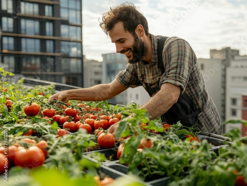 Happy Farmer Harvesting Ripe Tomatoes on Rooftop Garden