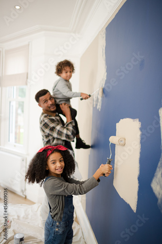 Happy father and children with paint rollers painting room