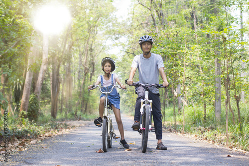 Happy father and daughter cycling in the park, togetherness relaxation concept