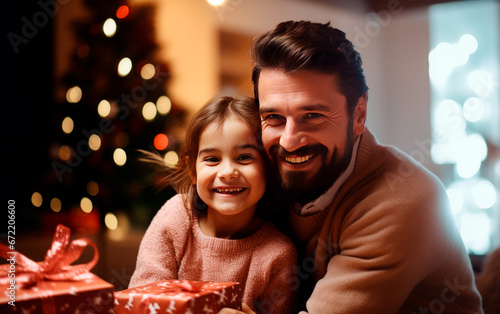 Happy father and daughter portrait with Christmas tree on the background. Christmas lights. Selective focus. Blurred background.