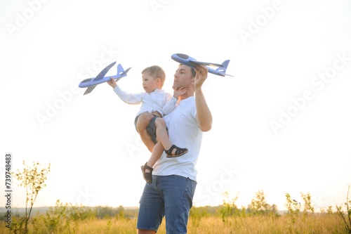 Happy father child moment. Father piggybacking his boy at sunset while he's playing with toy plane.