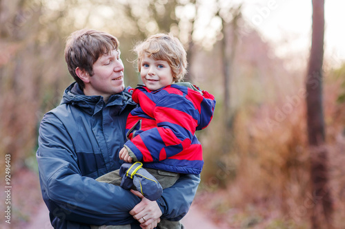 Happy father with his son on arm outdoors