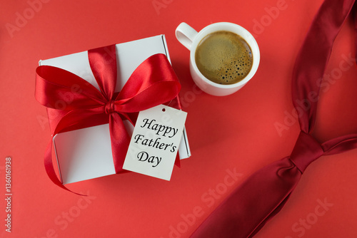 Happy Father's Day. Gift box with red bow and accessories on red background. Card, banner, layout for Father's Day.
