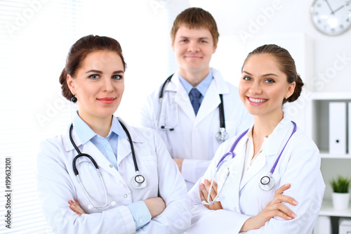 Happy female doctor keeping medical clipboard while medical staff are at the background