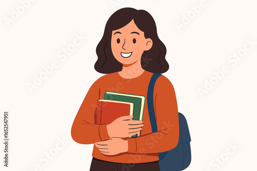 Happy female student with backpack holding books. Young smiling woman ready for university or college course. Education and learning concept. Flat vector illustration character.
