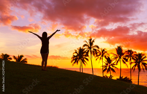 Happy female with arms up enjoying a beautiful tropical sunset.