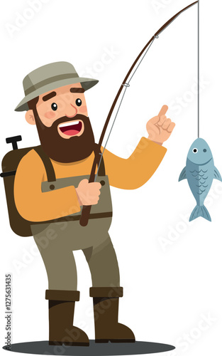 Happy fisherman with a beard holding a fish, wearing a wide-brimmed hat and fishing gear in a playful flat vector illustration