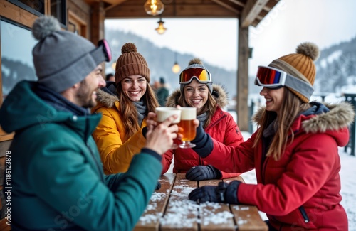Happy friends enjoying drinks in ski resort cafe. Group of young men, women celebrating after skiing day. Wearing warm winter clothing, smiling, laughing. Winter day. Snowy view. Cozy cafe in