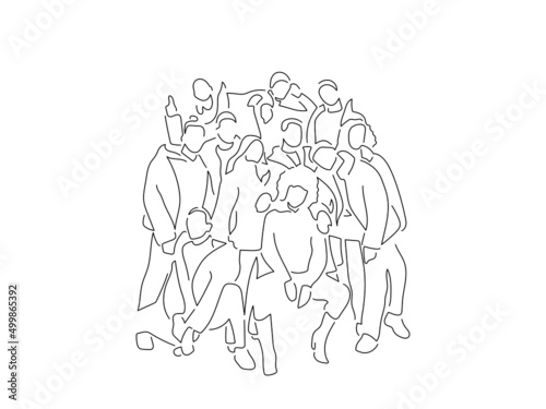 Happy friends in line art drawing style. Composition of a group of casual people. Black linear sketch isolated on white background. Vector illustration design.