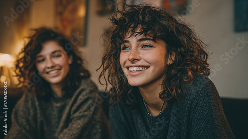 happy friends sitting on sofa smiling and chatting in cozy living room positive joyful moment casual conversation relaxed atmosphere friendly home interior