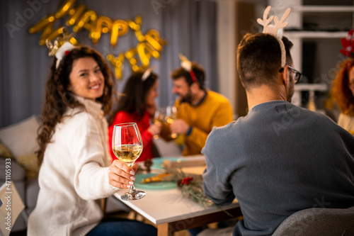 Happy friends toasting at Christmas dinner at home.