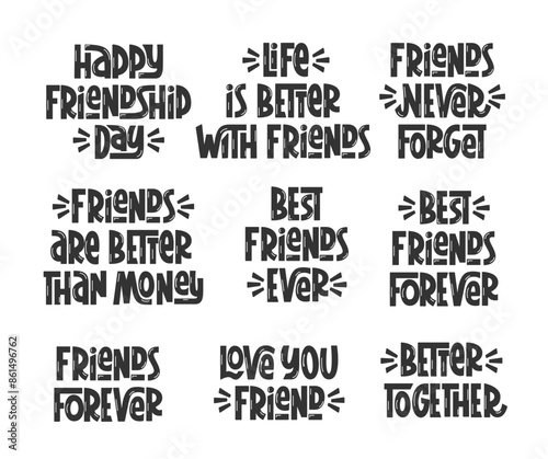 Happy Friendship Day Quotes Set. Vector Hand Lettering of Phrases for Friends Collection. Best Friends Forever, Better Together, Friends are Better Than Money Sayings.