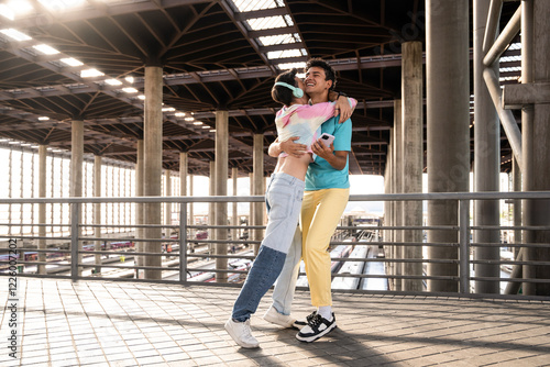 Happy gay couple embracing at modern train station under sunlight