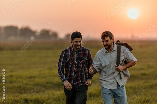 Happy gay couple having fun while moving up the hill in autumn day at sunset. Copy space.