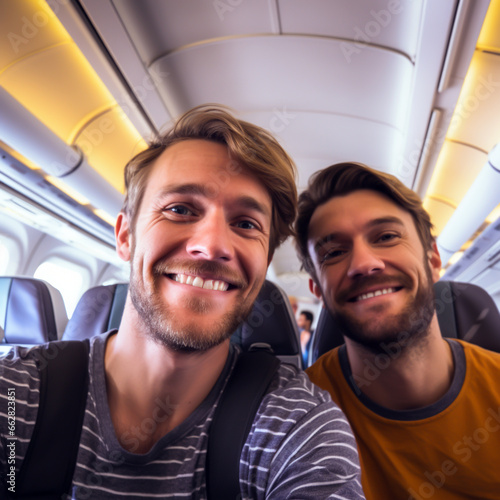 HAPPY GAY COUPLE TAKING SELFIE IN THE AIRPLANE CABIN. image created by legal AI