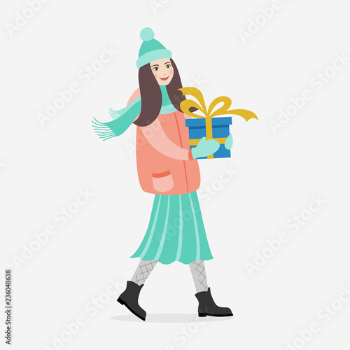 Happy girl carries a gift. Preparing for the New Year and Christmas. Flat illustration for design.