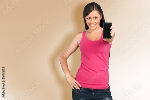 Happy girl cheering, winning, celebrating win, standing over beige background
