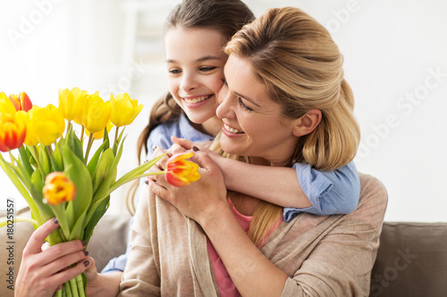 happy girl giving flowers to mother at home