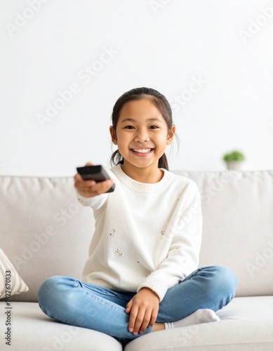 Happy Girl Holding Remote Control on Sofa Watching TV.