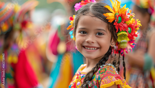 Happy girl in colorful traditional attire with other children in the background, vibrant festival