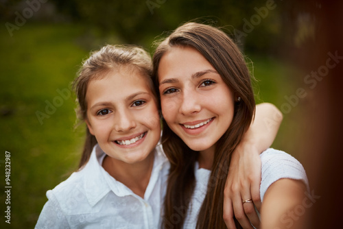 Happy girl, portrait and sisters with selfie in nature for photography, picture or outdoor memory together. Young, female person or siblings with smile for childhood moment or growth in backyard