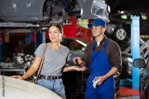 Happy girl with near her car being repaired. Auto mechanic give her the car keys