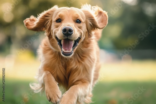 Happy golden retriever running joyfully in a green park on a sunny day. Generative AI