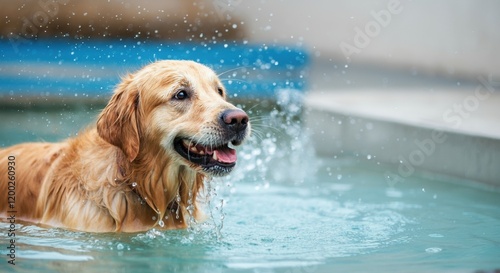 Happy golden retriever splashing in a pool, enjoying a sunny day